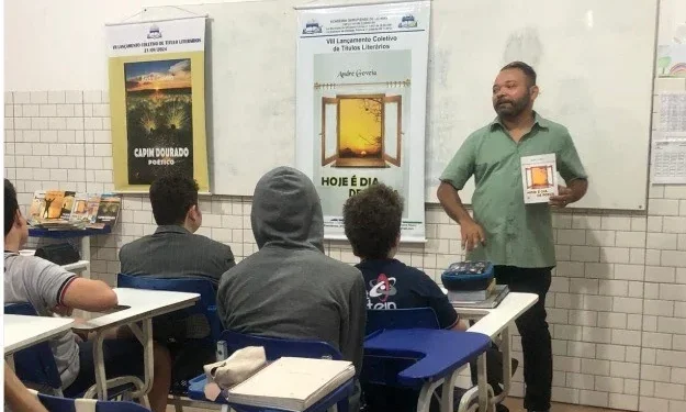 No último dia 18, o Colégio Albert Einstein, em Palmas, recebeu a visita ilustre do poeta e professor André Goveia, que foi a atração especial do sarau literário “Vozes do Cerrado: Cantos, Contos e Encantos do Tocantins“. Na oportunidade, Goveia participou de uma roda de conversa literária, onde falou um pouco da sua trajetória cultural e destacou a importância da leitura na formação intelectual dos alunos.