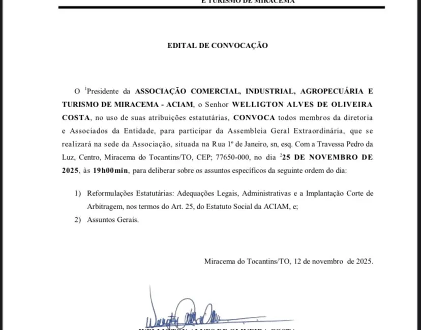 A Associação Comercial, Industrial, Agropecuária e Turismo de Miracema – ACIAM convida todos os seus associados e membros da diretoria para participarem da Assembleia Geral Extraordinária, que acontecerá no dia 25 de novembro de 2025, às 19h00, na sede da ACIAM no auditório Elpídio Rodrigues Alves, situada na Rua 1º de Janeiro, esquina com a Travessa Pedro da Luz, Centro – Miracema do Tocantins/TO.