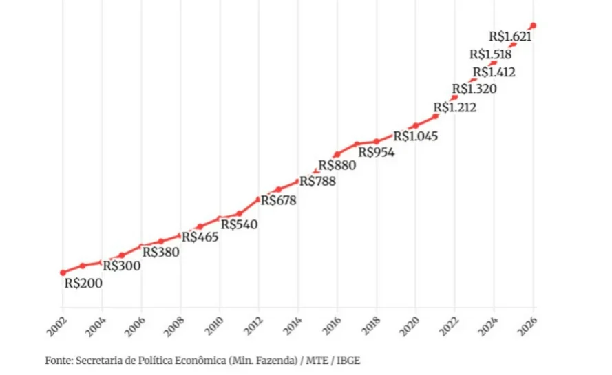 Evolução do salário mínimo entre 2002 e 2026