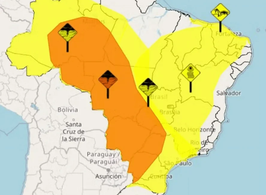 Outro alerta, amarelo, indica “perigo potencial” para chuvas intensas também até 10h de amanhã. O aviso inclui a totalidade dos Estados de Santa Catarina, Paraná, São Paul e Mato Grosso do Sul, além de áreas no Rio de Janeiro, Minas Gerais, Goiás, Mato Grosso e Pará.