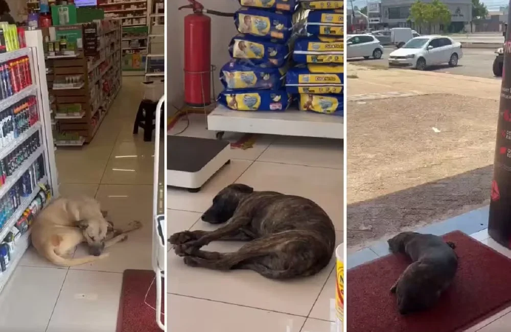 Nos vídeos que a jovem gravou, é possível ver um cão de grande porte deitado próximo a uma prateleira da farmácia, local onde bate um vento mais gelado do sistema de ar-condicionado.
