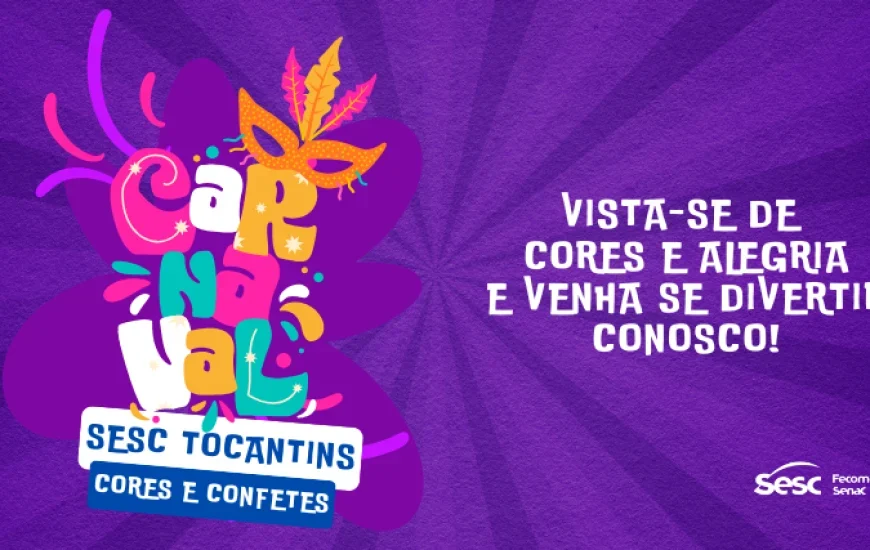 Com o tema Cores e Confetes, o Sesc Tocantins promove, no dia 12 de fevereiro, uma programação especial de carnaval voltada para toda a família, com atividades simultâneas em Palmas, Araguaína e Gurupi. A festa será realizada no Centro de Atividades do Sesc Palmas (502 Norte), no Centro de Atividades Sesc Araguaína – Anselmo da Silva Moraes e no Centro de Atividades Sesc Gurupi, com entrada solidária mediante a doação de 1 kg de alimento não perecível, que será destinado a instituições atendidas pelo programa Sesc Mesa Brasil.