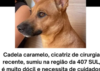 Uma cadela caramelo, que atende pelo nome de "Duda", está desaparecida na região da Quadra 407 Sul, em Palmas. A...