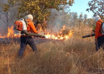 Durante ação de combate a incêndio na região da Saroba, no Setor Santa Bárbara, sul da Capital, brigadistas da Prefeitura...