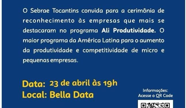 Para reconhecer e valorizar os empreendedores que participaram do programa ALI/Produtividade, o Sebrae Tocantins realiza na noite desta terça-feira, 23, em Palmas, a cerimônia de reconhecimento às empresas que mais se destacaram no programa ALI Produtividade. A iniciativa apresenta os cases de sucesso das empresas atendidas pelos Agentes Locais de Inovação.