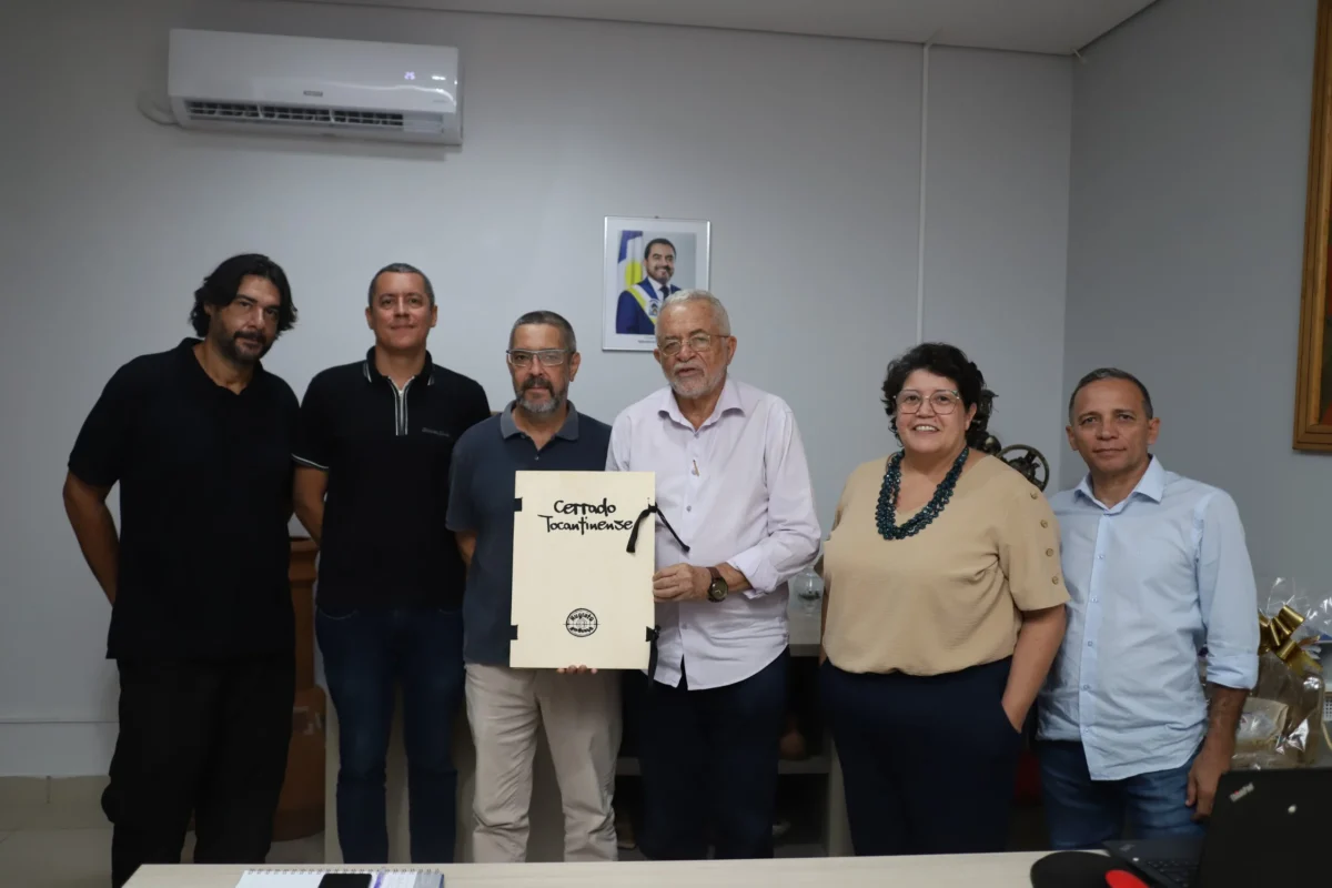 Os artistas visuais Cláudio Montanari, Tiago Beraldi e Pablo Marquinho visitaram a Secretaria da Cultura (Secult) para entregar oficialmente o primeiro álbum de gravuras do Tocantins, fruto de um projeto viabilizado pela Lei Paulo Gustavo e executado por meio de edital estadual lançado pela pasta. A entrega ocorreu nesta terça-feira, 17, no gabinete do secretário Tião Pinheiro, que estava acompanhado da secretária-executiva Valéria Kurovski e do superintendente de Fomento e Incentivo à Cultura, Antônio Miranda.