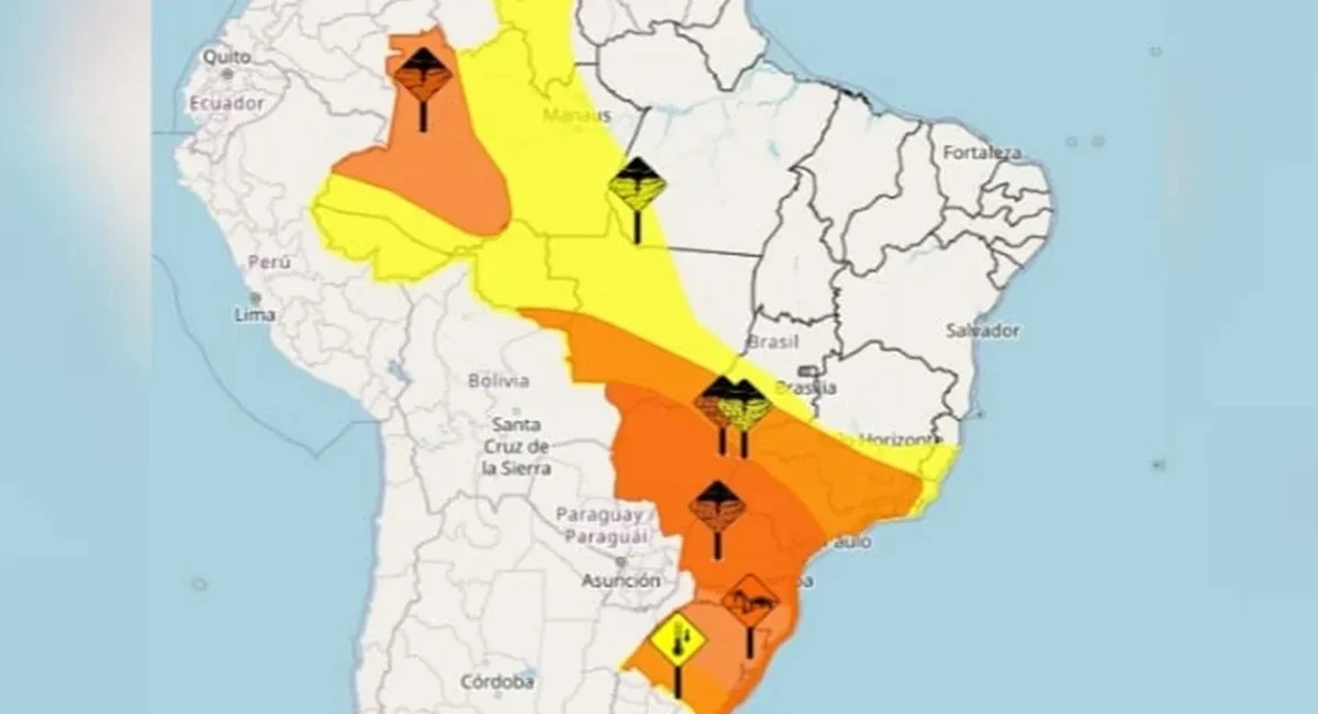 O alerta laranja de tempestade, vigente até as 8h desta terça-feira (18/11), cobre os estados do Paraná, São Paulo e Mato Grosso do Sul por inteiro e partes de Santa Catarina, Mato Grosso, Goiás, Rondônia, Minas Gerais e Rio de Janeiro.