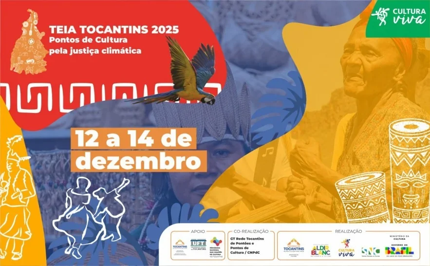 A Teia Tocantins 2025: Pontos de Cultura pela Justiça Climática será realizada de 12 a 14 de dezembro, com programação em Palmas e Taquaruçu, reunindo representantes de Pontos e Pontões de Cultura de todo o Estado. Esta edição tem como foco dialogar sobre diversidade cultural, sustentabilidade, implementação da Política Nacional de Cultura Viva (PNCV) e o papel da cultura diante da emergência climática.