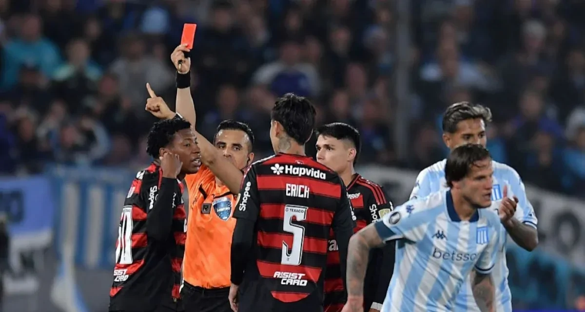 Na gravação divulgada pela Conmebol, é possível ouvir o assistente afirmando que houve agressão: “O jogador do Racing tenta levantar o do Flamengo pela camisa. E o jogador do Flamengo lhe dá um golpe, com o punho, nas genitais”, diz Urrutia, árbitro assistente. Em seguida, o VAR Juan Lara confirma: “Conduta violenta. Vai ter que expulsá-lo”.
