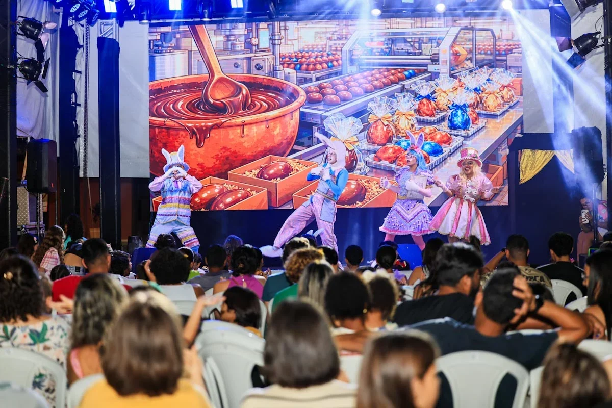 A estrutura do evento inclui praça de alimentação, brinquedos infláveis e palco para apresentações culturais, além de uma decoração temática que ajuda a transportar as crianças para o universo simbólico da Páscoa.