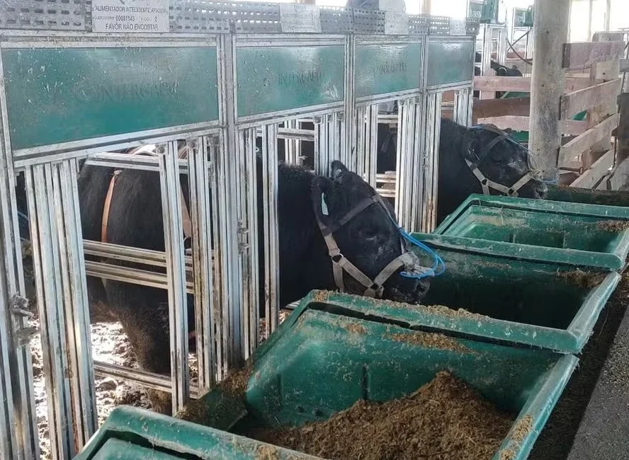 No momento, 28 novilhos da raça Brangus, selecionados do rebanho da Embrapa Pecuária Sul, em Bagé (RS), estão passando pela adaptação no cocho automatizado, para avaliar o uso do farelo de uva como suplemento na pastagem de inverno. Esse equipamento será o responsável por medir quanto de ração cada animal consome. Nestes bovinos, além da medição do consumo diário de forragem, também será contabilizada a emissão de metano.