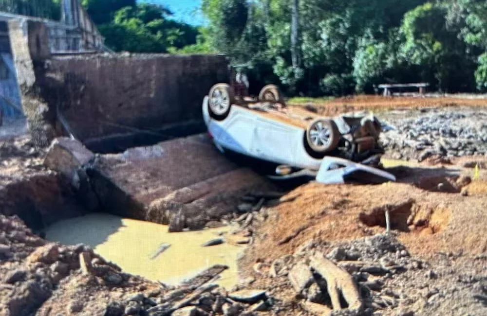 O acidente foi registrado no dia 31 de agosto deste ano. Conforme a polícia, o carro seguia por uma estrada vicinal que liga o município a um assentamento e acabou capotando após cair no local das obras da ponte.