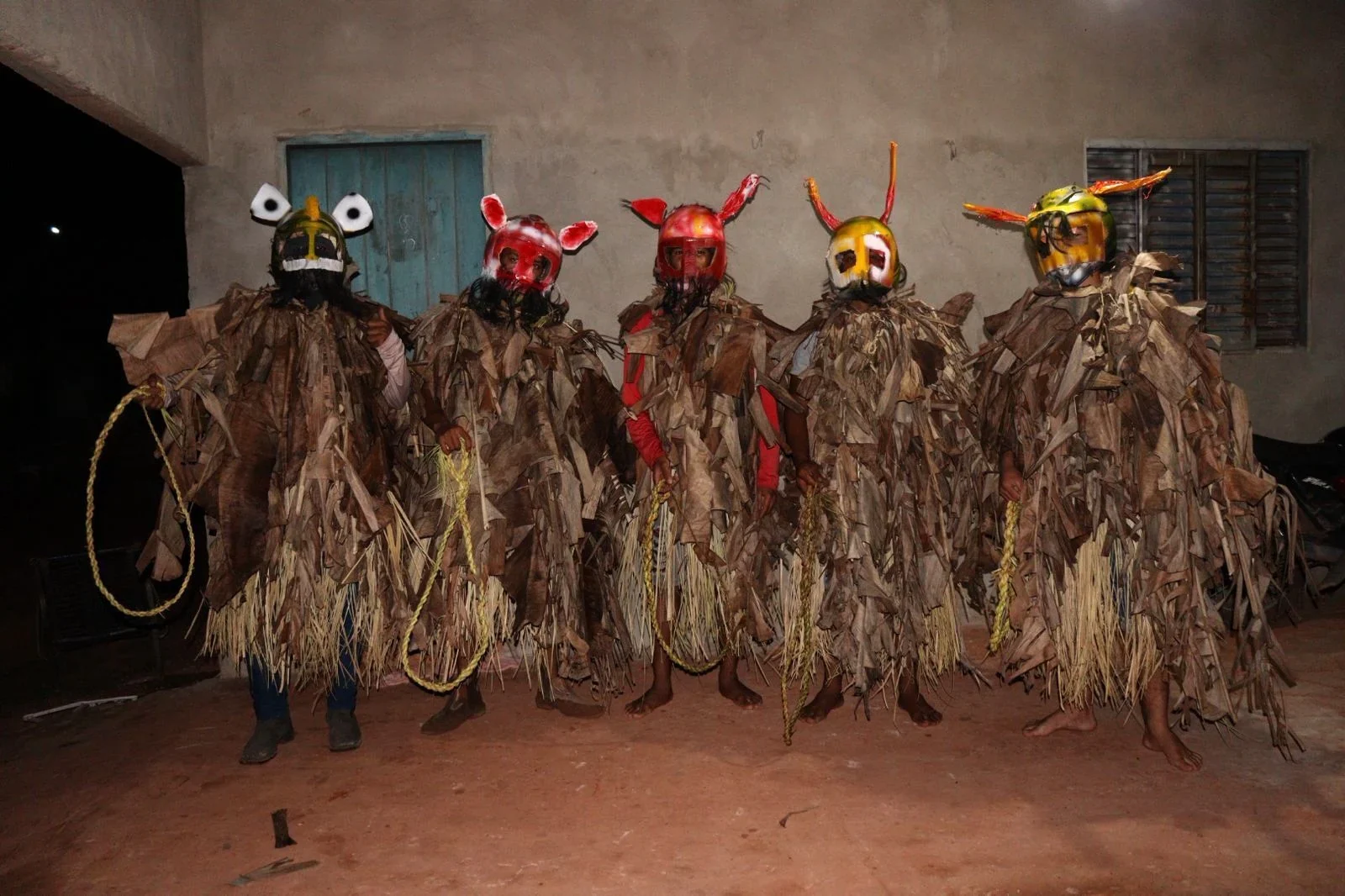 Para encerrar esse período, a comunidade realiza a brincadeira dos caretas. Os participantes utilizam máscaras grandes, feitas de couro, papel ou cabaça, muitas vezes com cabelos de peles de animais. O corpo é coberto com folhas de bananeira secas e embiras de buriti, garantindo o anonimato dos brincantes.