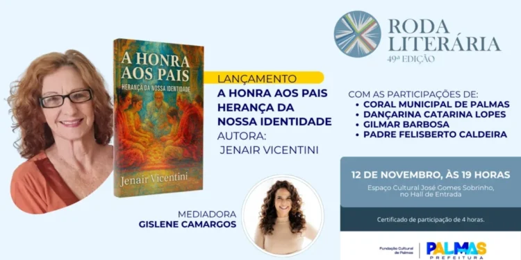 A 49ª edição do projeto Roda Literária, da Fundação Cultural de Palmas (FCP), lança o livro ‘A honra aos pais: herança da nossa identidade’. Gratuita, a atividade acontece no Espaço Cultural José Gomes Sobrinho, na Capital, nesta quarta-feira, 12, às 19 horas; e além do bate-papo com a autora Jenair Vicentini, ela também conta com a participação de convidados especiais para esta noite de valoração da arte literária e da cultura.