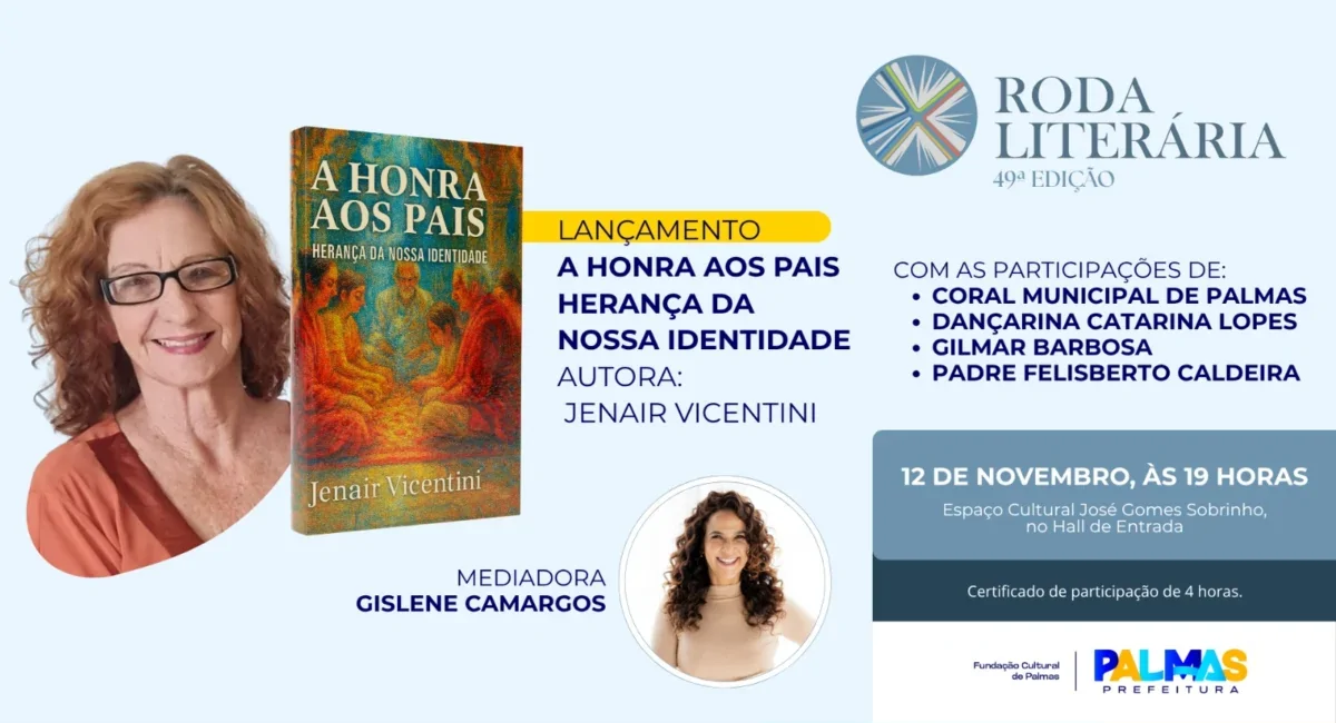 A 49ª edição do projeto Roda Literária, da Fundação Cultural de Palmas (FCP), lança o livro ‘A honra aos pais: herança da nossa identidade’. Gratuita, a atividade acontece no Espaço Cultural José Gomes Sobrinho, na Capital, nesta quarta-feira, 12, às 19 horas; e além do bate-papo com a autora Jenair Vicentini, ela também conta com a participação de convidados especiais para esta noite de valoração da arte literária e da cultura.