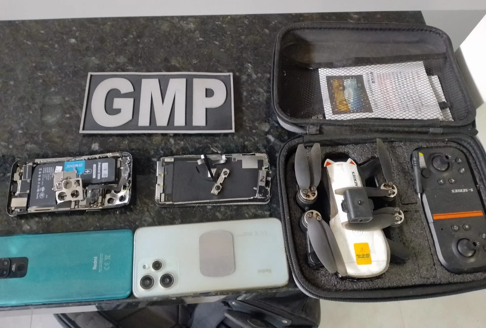 O automóvel foi localizado e abordado na Avenida Maranhão do Jardim Aureny I. Durante a ação, o motorista apresentou-se como condutor de aplicativo, enquanto o passageiro foi apontado como um dos responsáveis pelos disparos. Na revista veicular, os agentes encontraram um drone, possivelmente utilizado na ação criminosa, e três aparelhos celulares.