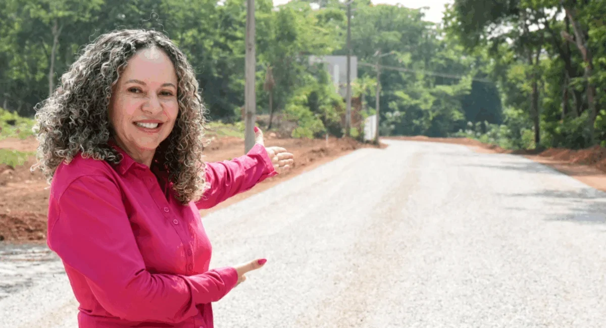 Prefeita Josi Nunes mostra obra de pavimentação asfáltica em andamento. Crédito: Prefeitura de Gurupi