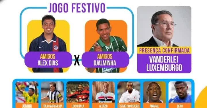 Competições esportivas amadoras acontecerão no Estádio Natanael Silva Moraes, dia 31, sexta, a partir das 17:00H e no começo da noite a grande atração será o jogo festivo “Amigos de Alex Dias” e “Amigos do Djalminha” com a presença de ex-jogadores consagrados do futebol brasileiro como o próprio Djalminha, Alex Dias, Aluísio Chulapa, Flávio Conceição, Amaral, Túlio Maravilha, Junior, Lúcio Bala, Beto e o treinador Vanderlei Luxemburgo.