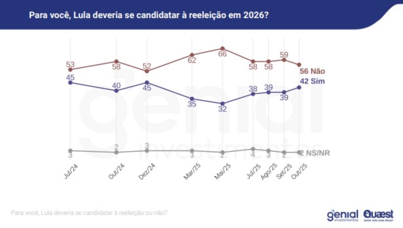 De acordo com a pesquisa, 56% dos entrevistados afirmaram que Lula não deveria se candidatar em 2026, enquanto 42% defendem nova disputa do petista. Em setembro, os números eram 59% contra e 39% a favor.
