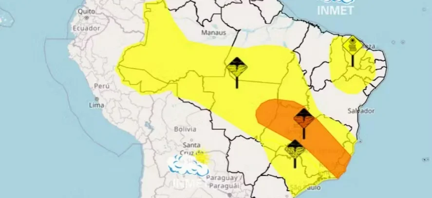 Esse alerta se estende por estados do Centro-Oeste, Sudeste, Norte e parte do Nordeste, incluindo Goiás, Minas Gerais, Mato Grosso, Mato Grosso do Sul, Tocantins, Espírito Santo, Rio de Janeiro, Maranhão, Rondônia, Acre, Amazonas, Pará e Bahia.