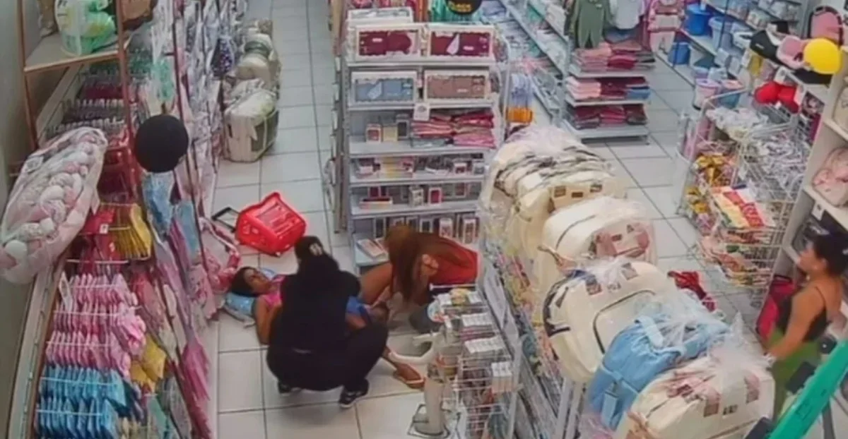 Por volta das 9h20, imagens da câmera de segurança registraram o momento em que a mãe entra na loja, começa a sentir fortes contrações e pede ajuda às funcionárias.
