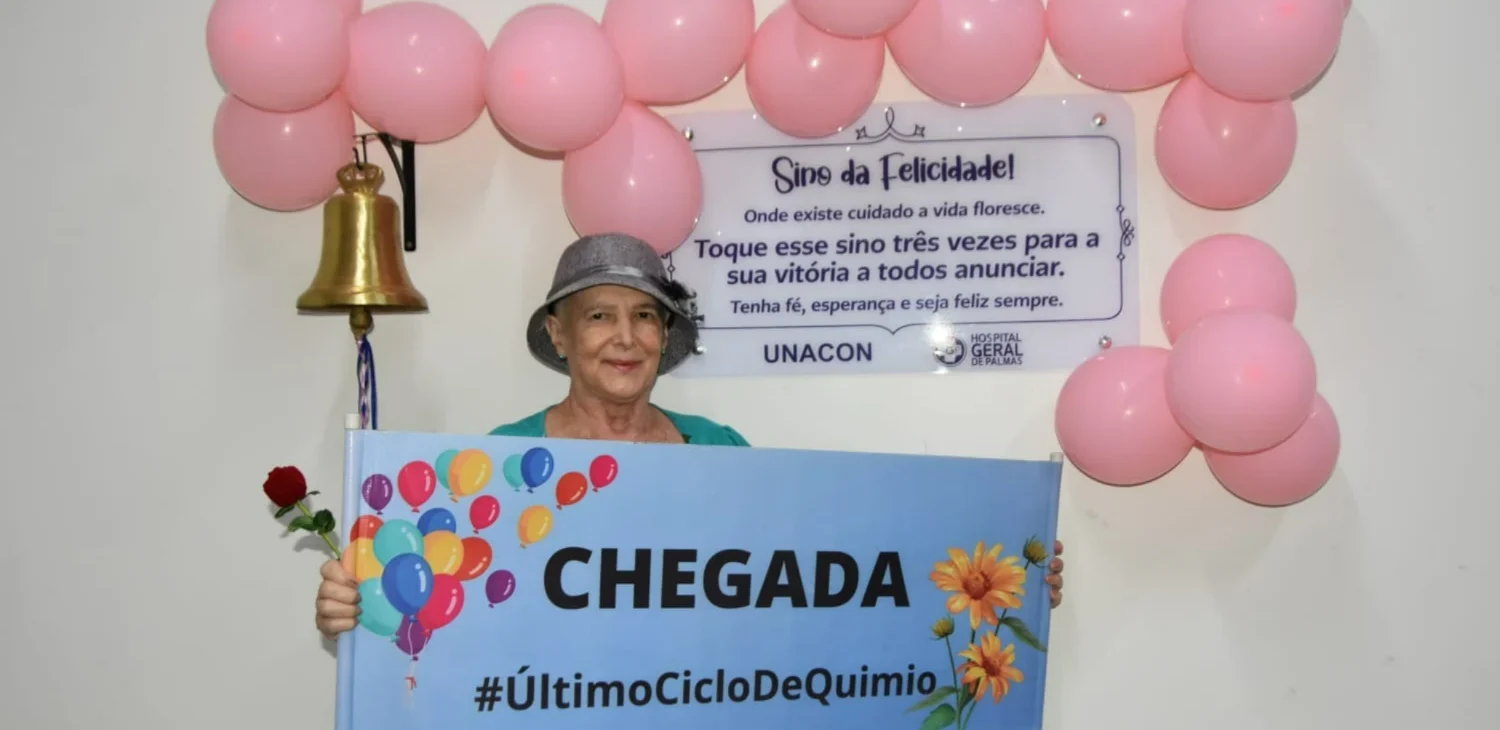 Em alusão ao Dia Mundial do Combate ao Câncer, celebrado em 8 de abril, o Hospital Geral de Palmas (HGP) vivenciou, na quarta-feira 7, um momento de celebração e superação. Após seis meses de tratamento na Unidade de Assistência de Alta Complexidade em Oncologia (Unacon), a paciente Rosenildes Dias Noleto, de 63 anos, tocou o “Sino da Felicidade”, símbolo de vitória e esperança.