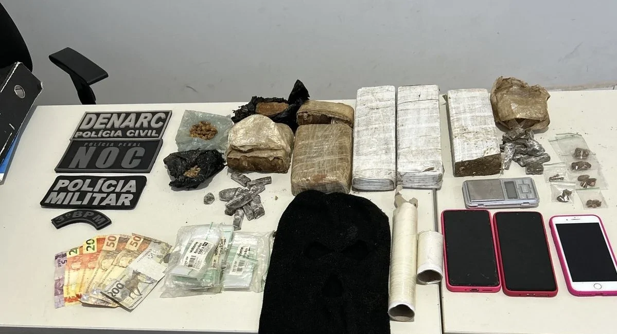 Durante revista na residência, foram encontrados uma balança de precisão, três aparelhos celulares e porções de substâncias análogas à maconha, entregues voluntariamente por D.N.A. Com o apoio do Núcleo de Operações com Cães (NOC) da Polícia Penal, os policiais realizaram buscas no matagal próximo e localizaram uma espécie de um tonel de leite enterrado contendo mais porções de substâncias análogas à maconha e crack.