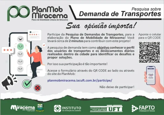A Prefeitura de Miracema do Tocantins informa que já está em andamento a Pesquisa de Demandas de Transportes para a elaboração do Plano de Mobilidade Urbana do município.