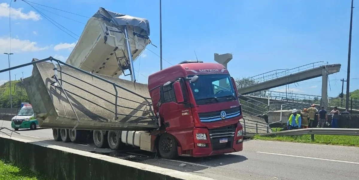 Uma passarela caiu sobre a pista da BR-116, em Guapimirim, no Rio de Janeiro, na manhã desta quarta-feira (19/11), após um caminhão atingir a estrutura no Km 124, próximo ao bairro Vila Inca. O impacto derrubou a passarela e os escombros sobre as duas faixas da rodovia.