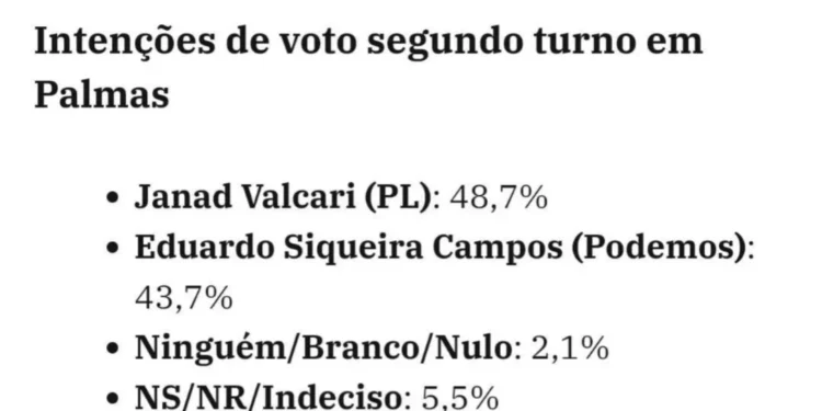 A pesquisa Futura Inteligência/Exame, divulgada nesta sexta-feira, 25, mostra uma virada espetacular da candidata a prefeita de Palmas, Janad Valcari (PL), sobre Eduardo Siqueira (Podemos).