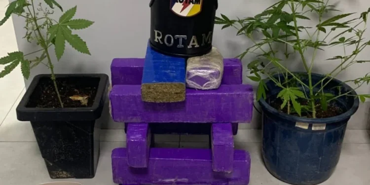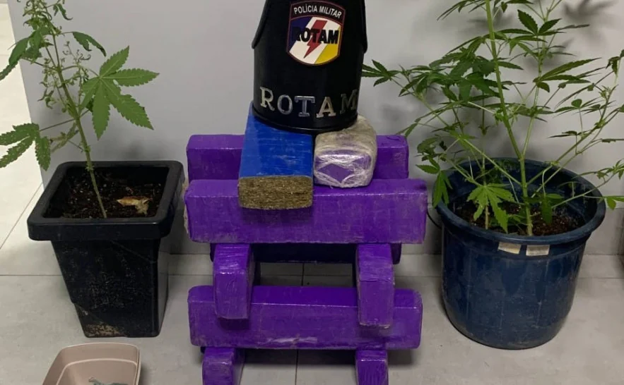 No local, os militares localizaram um saco contendo diversos tabletes de substância análoga à maconha, além de uma faca utilizada para o fracionamento da droga. Em diligências no ambiente, foram encontrados dois pés de maconha cultivados. As equipes também apreenderam uma arma de fogo, munições de calibre .22 (duas intactas e uma deflagrada), balança de precisão e dinheiro em espécie. Ao todo, foram apreendidos mais de dez quilogramas e cem gramas de maconha.
