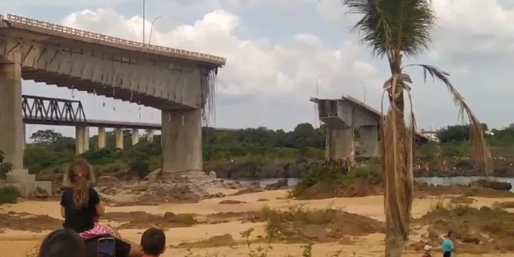 Parte da estrutura da ponte que liga Aguiarnópolis, no Tocantins, a Estreito, no Maranhão, desabou no início da tarde deste domingo, 22. Vídeos e fotos do desabamento estão circulando nas redes sociais e até o momento não há confirmação oficial de vítimas. Há relatos de que uma mulher morreu. Ela estaria em dos caminhões que fazia a travessia no momento do desabamento.