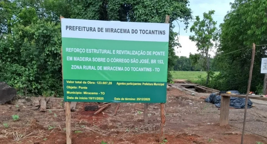 A Prefeitura de Miracema do Tocantins, por meio do Departamento de Engenharia Civil, acompanha de perto a obra de reforço estrutural e revitalização da ponte de madeira sobre o Córrego São José, localizada na BR-153, zona rural do município, próximo à cidade de Paraíso do Tocantins.