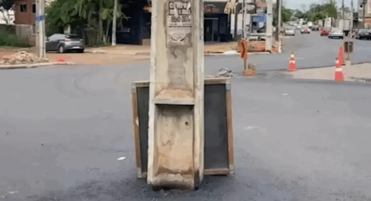 Um poste no meio de uma rua na cidade de Cascavel, no Paraná, chama a atenção de pedestres e motoristas que passam pelo local.