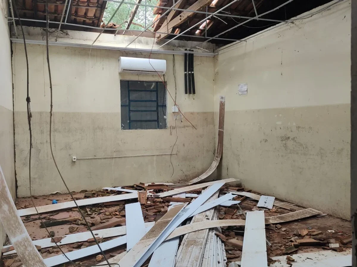 Entre os problemas identificados estavam as condições precárias do telhado, falhas nos sistemas hidráulico e elétrico, infiltrações, além de outras situações estruturais que se arrastavam há anos e comprometiam o funcionamento adequado da escola.