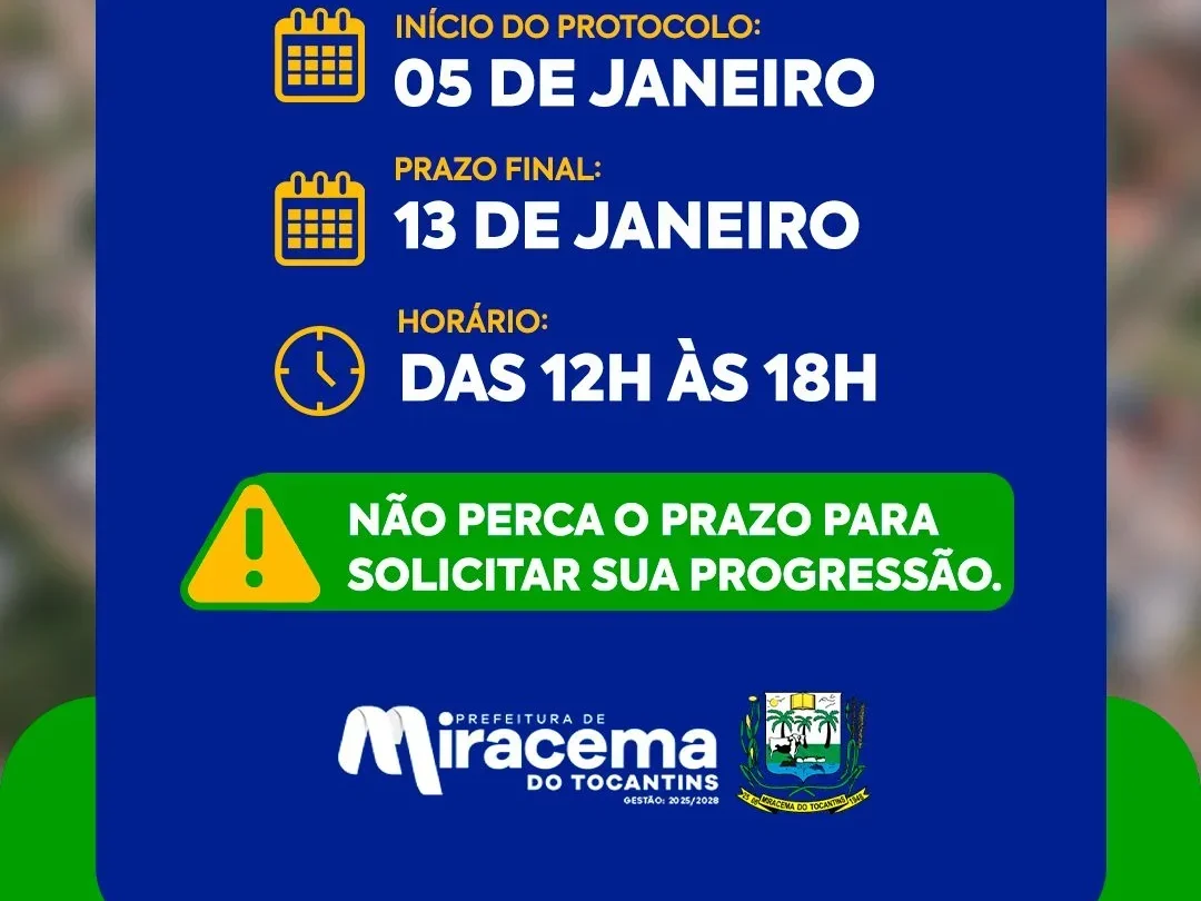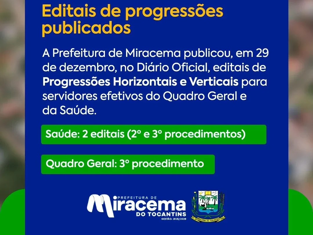 A Prefeitura Municipal de Miracema do Tocantins publicou, no dia 29 de dezembro, no Diário Oficial do Município, três editais de Progressões Horizontais e Verticais destinados aos servidores efetivos do Quadro Geral e da Saúde. Ainda no mês de dezembro, já havia sido publicado edital específico para os profissionais da Educação que possuem interstício de progressão no mês de setembro.