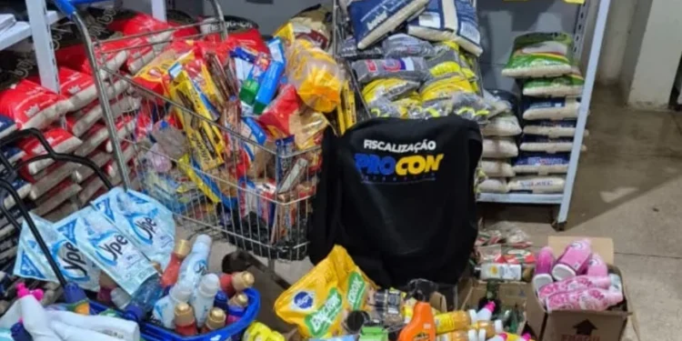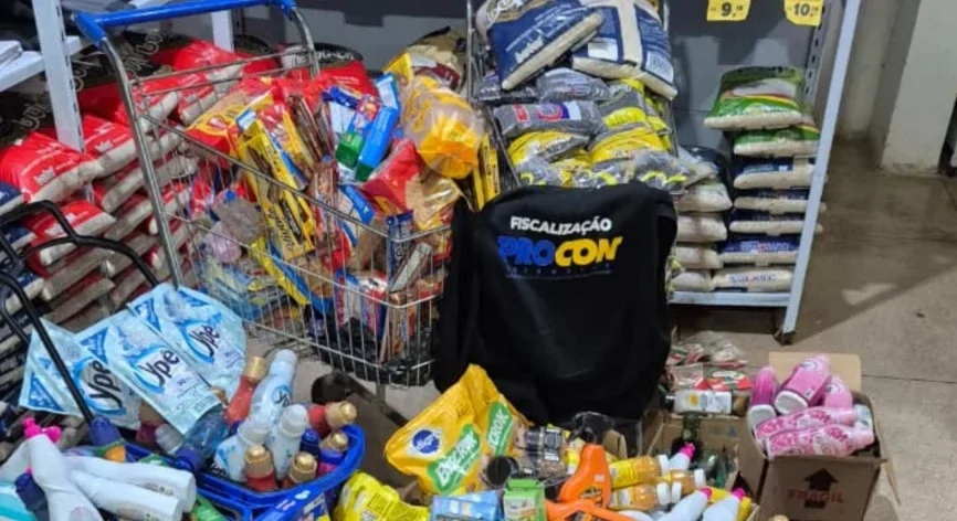 Durante a fiscalização, foram lavrados dez autos de infração por irregularidades como a comercialização de produtos vencidos, sem informação de fabricação e validade, além de mercadorias proibidas para a venda direta ao consumidor. Entre os itens recolhidos estavam farinha de trigo, café, calabresa fatiada, sorvete, refrigerantes, óleo de coco, feijão preto, arroz, biscoitos, muçarela fatiada, sucos em pó, macarrão instantâneo, ração para cachorro, desinfetante, azeite, entre outros.
