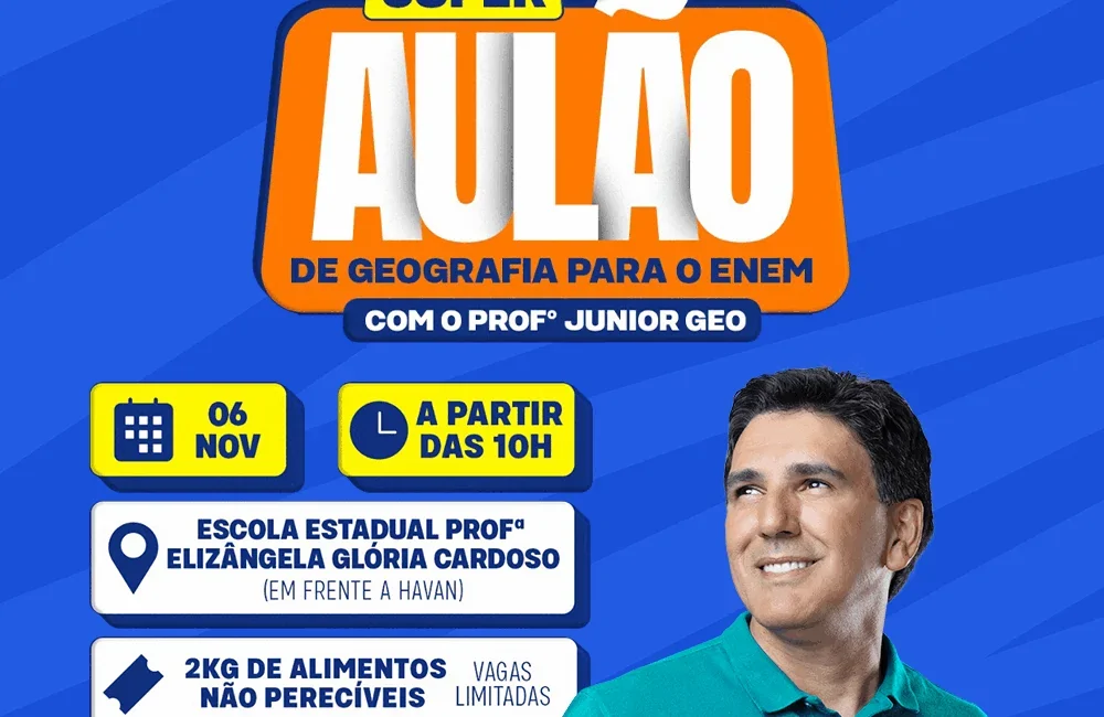 Com o objetivo de apoiar os estudantes que se preparam para o Exame Nacional do Ensino Médio (Enem), o deputado estadual Professor Júnior Geo (PSDB) realiza um Super Aulão de Geografia. A ação, feita em parceria com a Escola Estadual Professora Elizângela Glória Cardoso, acontece nesta quinta-feira, dia 6, no auditório da instituição, a partir das 10h. As provas serão aplicadas neste domingo, dia 9, e no próximo, dia 16.