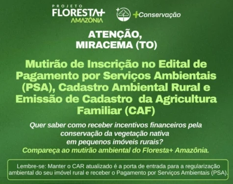 O Projeto Floresta+ Amazônia estará em Miracema do Tocantins entre 09 e 12 de março, das 8h às 17h, com um grande mutirão para inscrição no Pagamento por Serviços Ambientais (PSA), atualização do CAR e emissão do CAF.