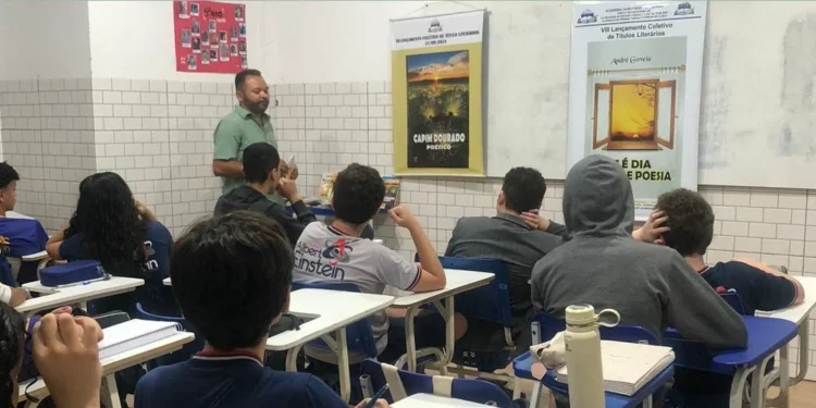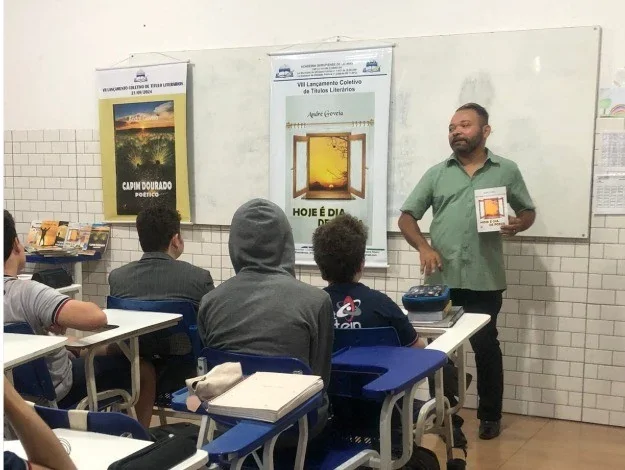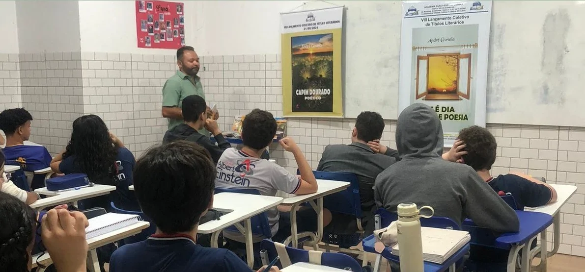 No último dia 18, o Colégio Albert Einstein, em Palmas, recebeu a visita ilustre do  poeta e professor André Goveia,  que foi a atração especial do  sarau literário “Vozes do Cerrado: Cantos, Contos e Encantos do Tocantins“. Na oportunidade, Goveia participou de uma roda de conversa literária, onde  falou um pouco da sua trajetória cultural e destacou a importância da leitura na formação intelectual dos alunos.