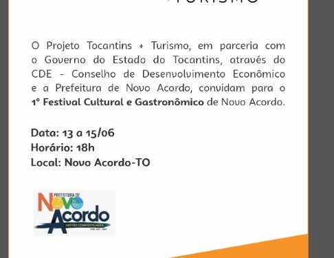A partir desta quarta-feira, 13, até o próximo sábado, 15, a cidade de Novo Acordo será palco do 1° Festival Cultural e Gastronômico. O Evento, realizado pelo Sebrae Tocantins, por meio do projeto Tocantins + Turismo, busca dar visibilidade às potencialidades locais, além de fortalecer o setor gastronômico, turístico e comercial da região.