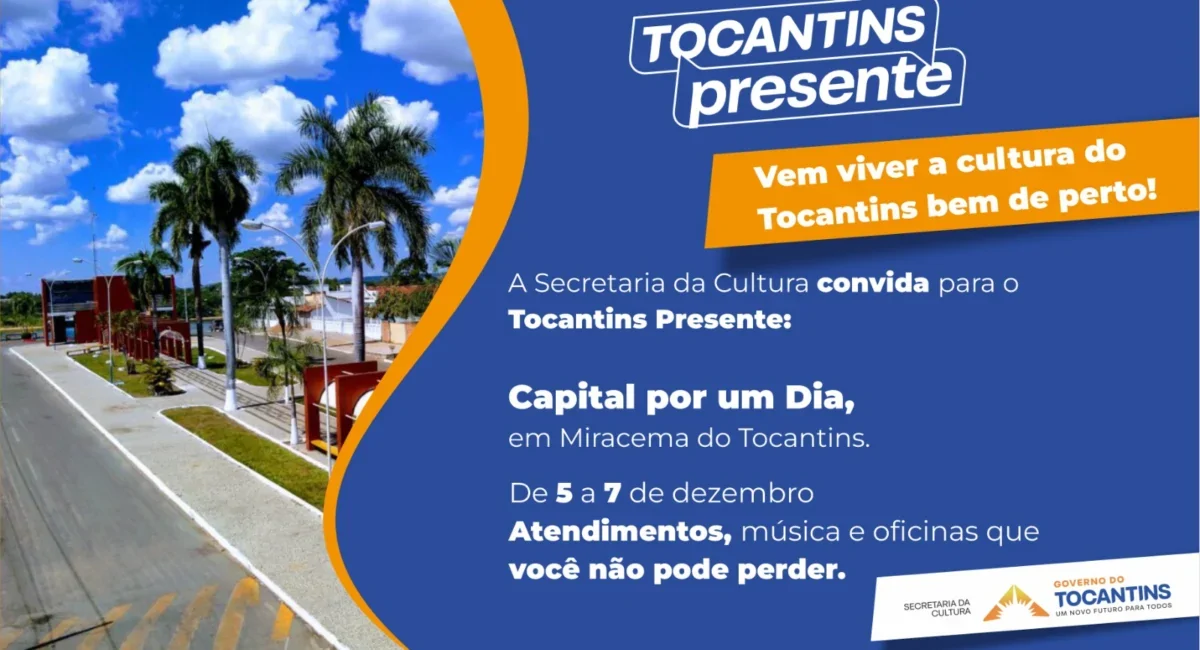 A Secretaria da Cultura do Tocantins (Secult) levará diversos serviços ao lançamento oficial do programa ‘Tocantins Presente’, do Governo do Tocantins, que será realizado em Miracema do Tocantins, nesta sexta-feira, 5, a domingo, 7 de dezembro, em frente à Câmara Municipal, no bairro Dona Filomena. Integrando a ação, a Secult participa com uma programação cultural especial preparada para o público, reforçando seu papel dentro do conjunto de atividades da ‘Capital por um Dia’ e contribuindo para aproximar ainda mais a política cultural da comunidade.