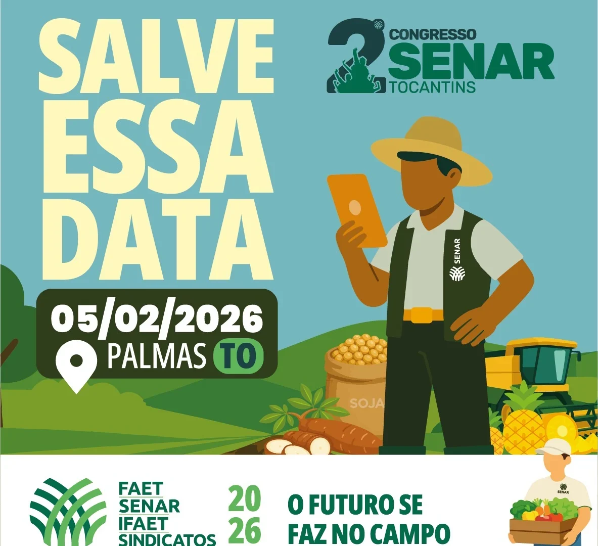 O Sistema FAET/Senar vai realizar no próximo dia 05 de fevereiro, um encontro institucional histórico que terá dois momentos importantes: a realização do 2º Congresso Senar e a Cerimônia de Posse da nova diretoria da Federação da Agricultura e Pecuária do Estado do Tocantins (FAET), para o quadriênio 2026-2029.