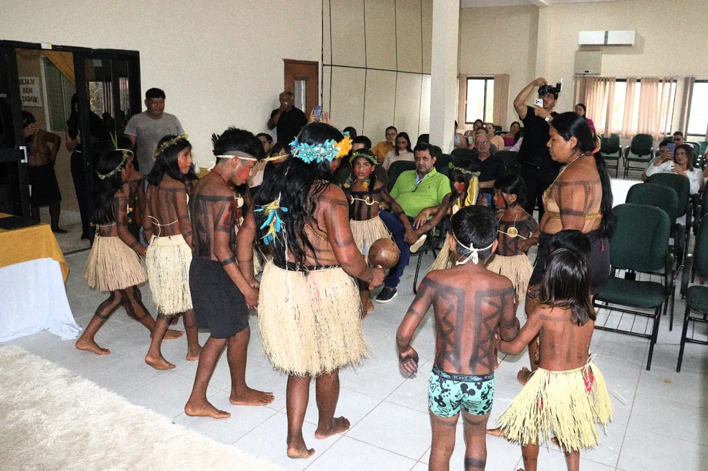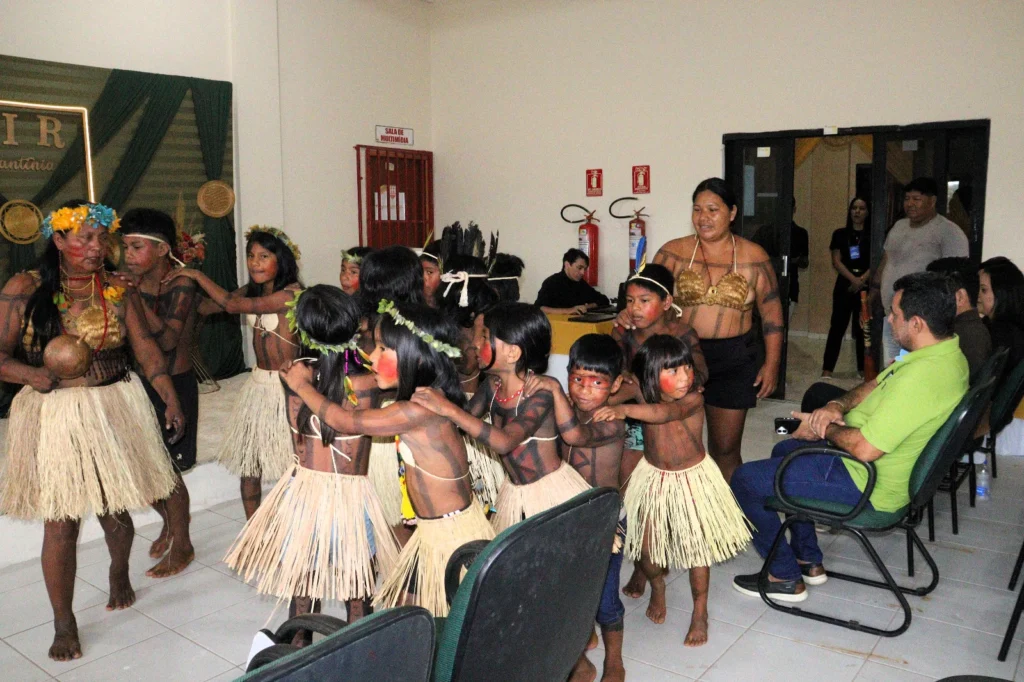 Antes do início das atividades, os gestores assistiram apresentação cultural de boas vindas das crianças indígenas Xerente.