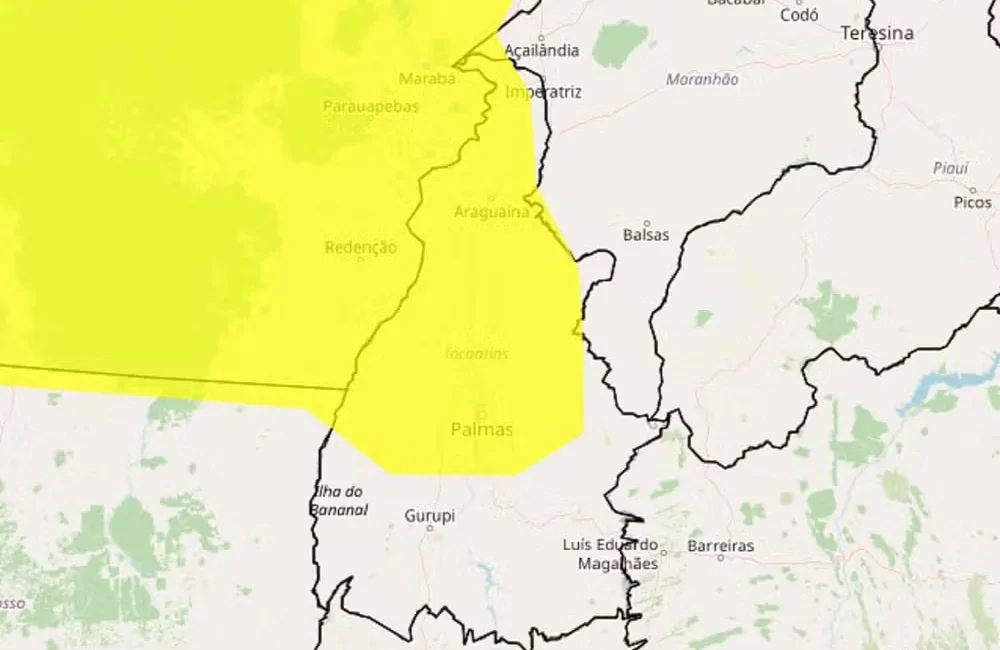 O Instituto Nacional de Meteorologia (Inmet) emitiu um alerta amarelo de chuvas intensas para grande parte do Tocantins, incluindo as regiões central, norte e Bico do Papagaio. O aviso começou nesta quarta-feira (8) e termina na quinta-feira (9), às 9h. A previsão é de chuvas com 20 a 30 milímetros por hora.