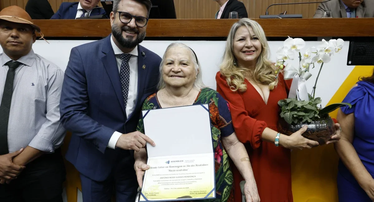 Acompanhada da filha, Denise Guedes, Dona Neide, agradeceu pelo reconhecimento da sua história de vida, que a deixou visivelmente feliz e emocionada. “Nós estamos tão contentes, porque minha mãe nunca recebeu uma homenagem tão especial. Não temos palavras para demonstrar a nossa gratidão ao deputado pela gentileza, pelo carinho e pela valorização da grande nordestina, que é a minha mãe, que se tornou avó de todos os palmenses”, celebrou Denise.