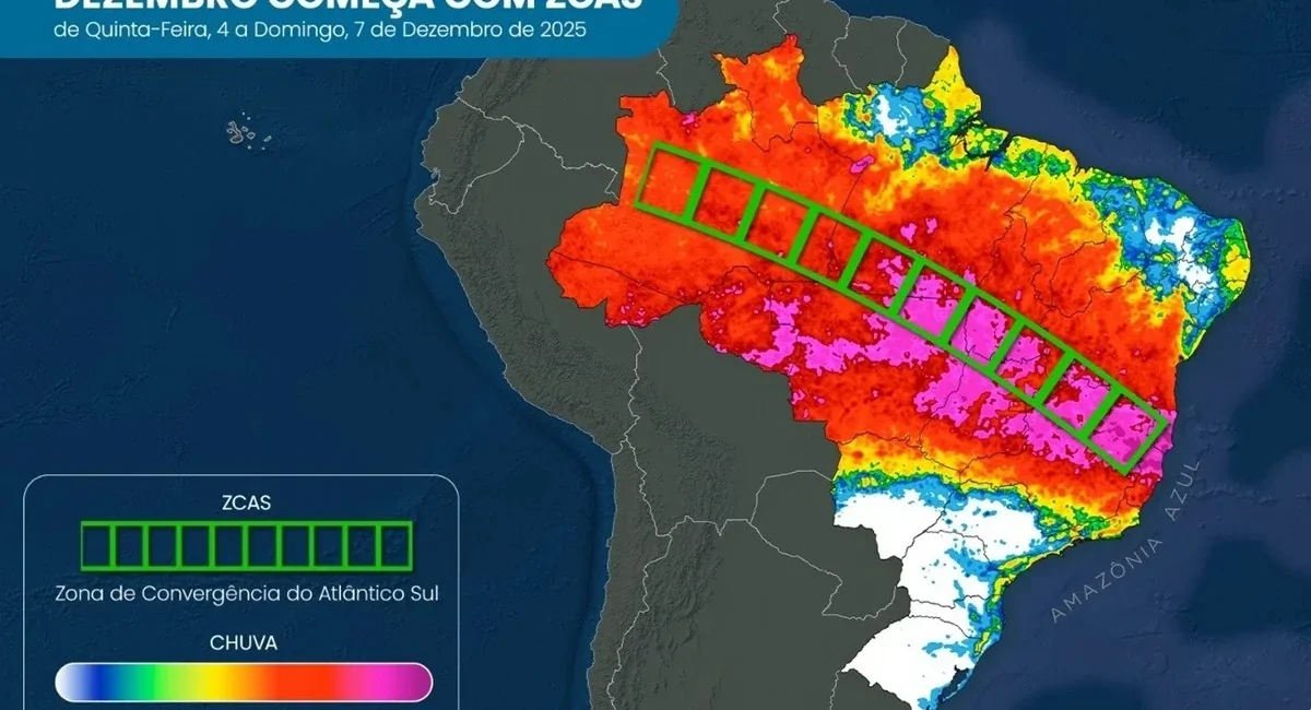 Um episódio da Zona de Convergência do Atlântico Sul (ZCAS) pode provocar chuvas intensas e ventos fortes em cinco estados brasileiros entre esta sexta-feira (5/12) e o próximo domingo (7/12).